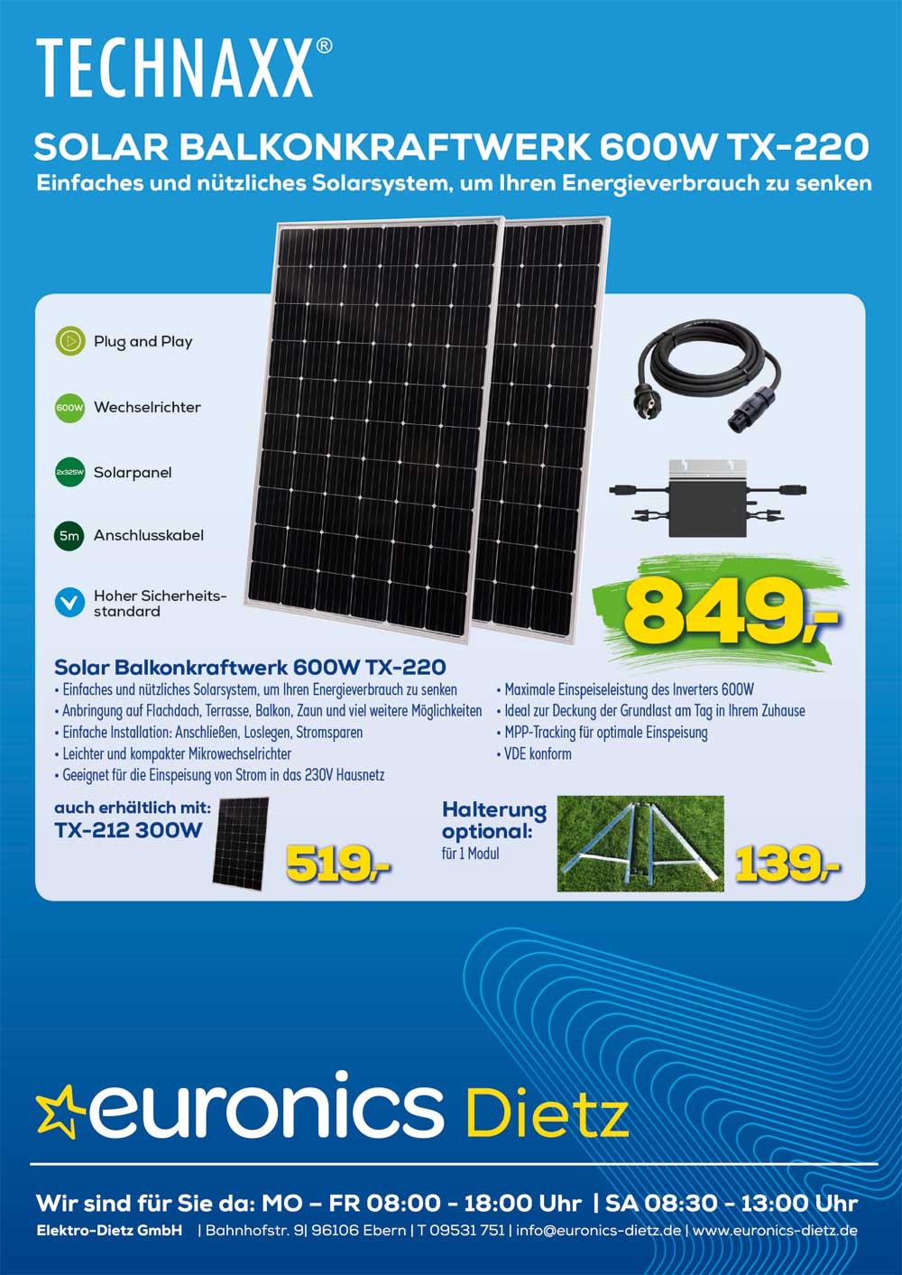In Zeiten von immer teurer werdenden Strompreisen haben wir einen Tipp für euch. Habt ihr euch schon einmal über ein Balkonkraftwerk Gedanken gemacht? Dann hat unsere Eberner Firma Euronics Dietz hier das passende Angebot für euch. Jetzt einfach selbst Strom erzeugen, den Energieverbrauch senken und somit bares Geld sparen, perfekt für euren Garten oder den Balkon.