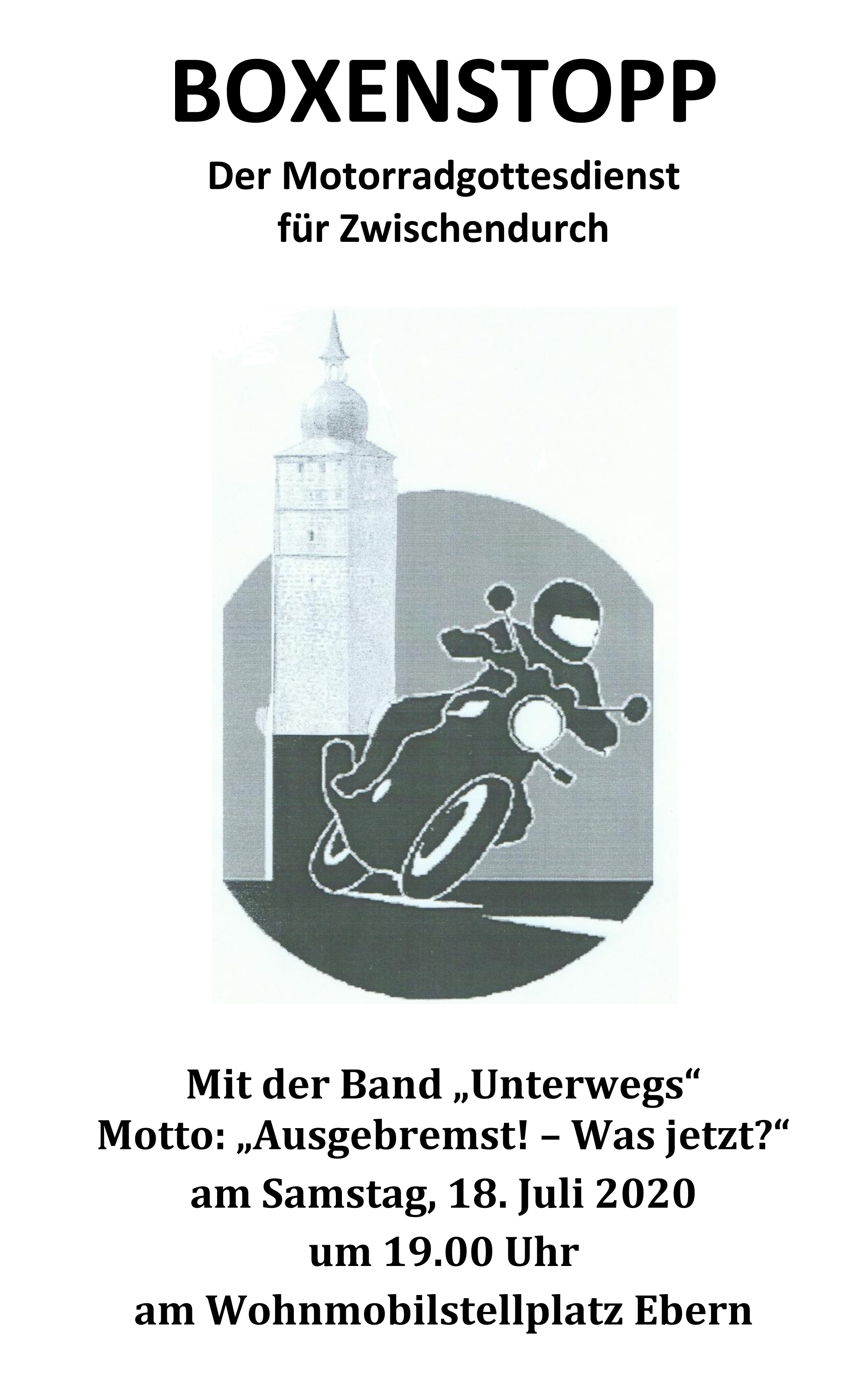 Am Samstag 18.07.2020 um 19.00 Uhr (geänderter Termin) findet auf dem Wohnmobilstellplatz wieder der beliebte ökumenische Openair Biker-Gottesdienst "Boxenstopp" statt. Die Band "Unterwegs" sorgt für die musikalische Umrahmung des Gottesdienstes unter dem Motto "Ausgebremst! - Was jetzt?"