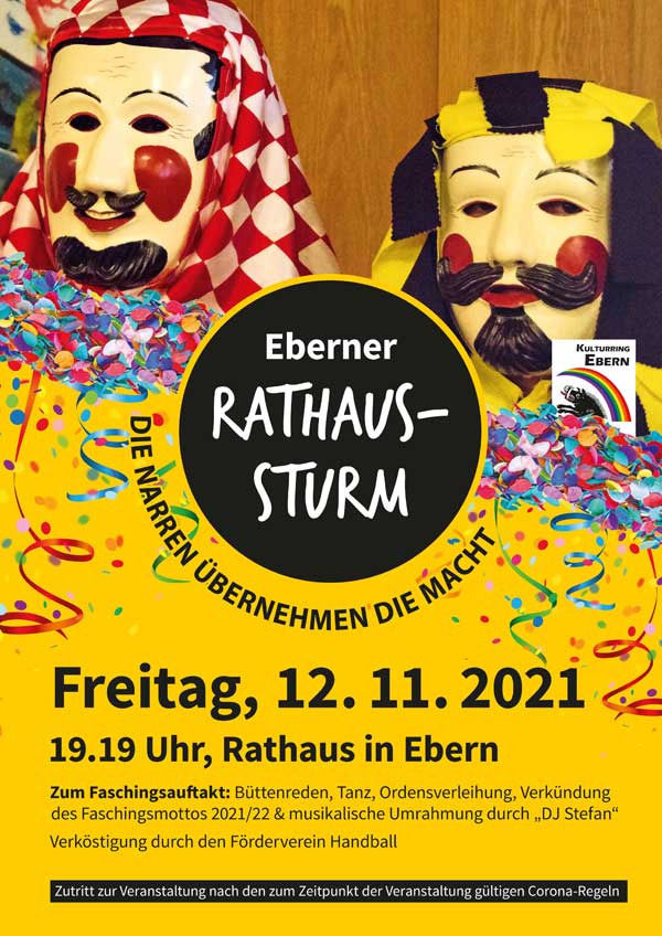 Nachdem bereits 2020 die Rathaushalle zum gewohnten Faschingsauftakt coronabedingt leer blieb, freuen sich die Elferräte des Kulturrings darauf, heuer wieder eine Präsenzveranstaltung mit Gästen durchführen zu können. Neben dem Einzug des Elferrats mitsamt Showtanzgarde und Faschingsmaskottchen „Schellenmann“ und „Schörschla“ steht natürlich die Übergabe von Rathausschlüssel, Amtskette und Stadtkasse im Mittelpunkt. Dann haben bis zum Aschermittwoch die Narren wieder das Sagen in der Stadt. Des Weiteren werden die Mädels der Showtanzgarde Ebern-Heubach das Tanzbein schwingen und zum Höhepunkt wird natürlich das Faschingsmotto für die Saison 2021/22 bekanntgegeben. Auch die Verabschiedung von zwei langjährigen Elferräten steht auf dem Programm. Beim Quiz ist wieder das Wissen der Gäste gefragt. Für die musikalische Umrahmung des rund einstündigen Programms sorgt wieder DJ Stefan. Anschließend herrscht noch gemütliches Beisammensein bei Musik sowie Bewirtung durch die Handballer des TV Ebern.