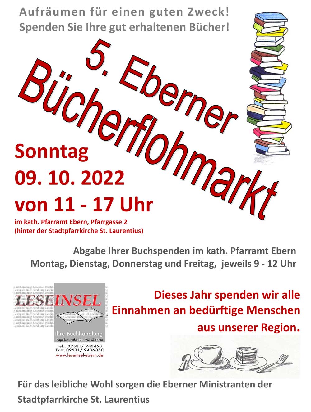 Der Bücherflohmarkt findet heuer wieder, bereits zum 5. Mal, im kath. Pfarramt Ebern statt. Am Sonntag 09.10.22 von 11 bis 17 Uhr kann in der großen Bücherauswahl nach Herzenslust gestöbert werden und auch für das leibliche Wohl ist durch die Eberner Ministranten der Stadtpfarrkirche St. Laurentius bestens gesorgt. Alle Einnahmen kommen bedürftigen Menschen in unserer Region zugute.