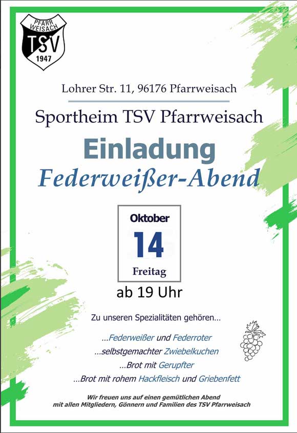 Der TSV Pfarrweisach lädt am Freitag 14. Oktober ab 19 Uhr zum Federweißerabend in das TSV Sportheim (Lohrer Str. 11, 96176 Pfarrweisach) ein.