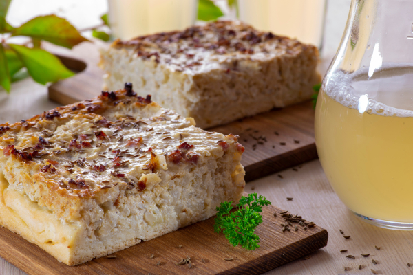 Neben Federweißer und Federroter gibt es weitere leckere Schmankerl wie z. B. selbstgemachter Zwiebelkuchen, herzhaftes Gerupftenbrot oder Brot mit rohem Hackfleisch bzw. Griebenfett.
