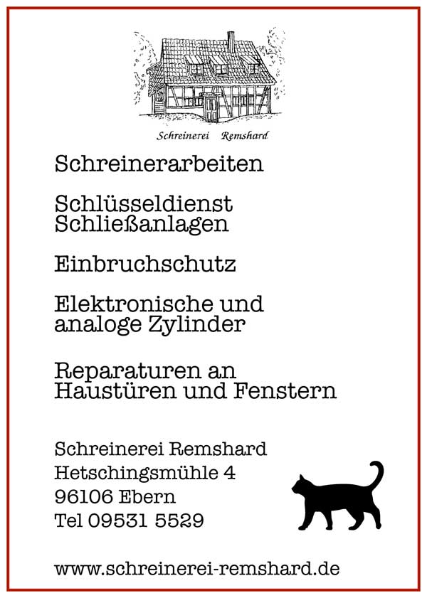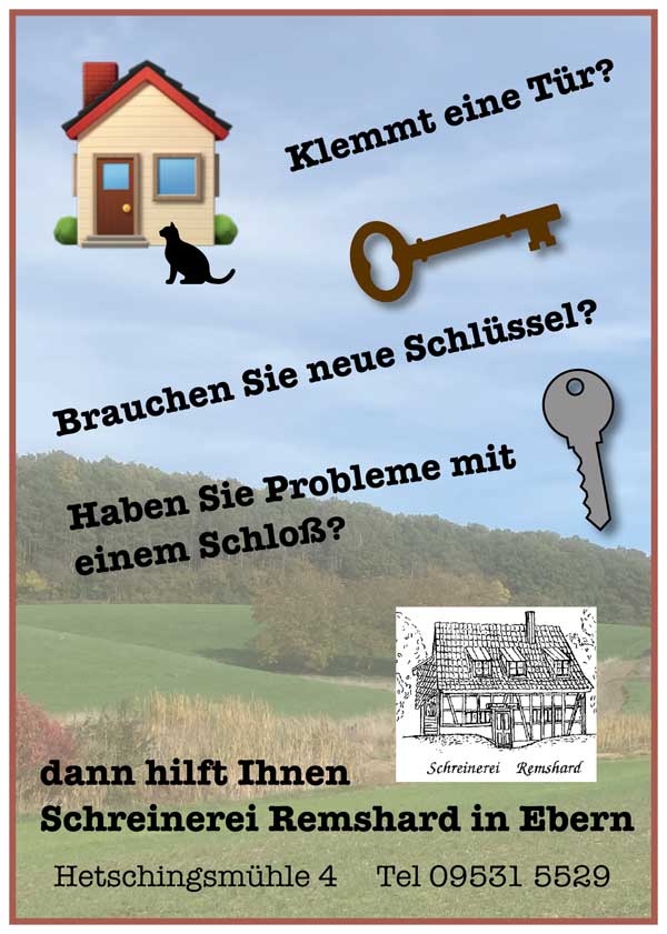 Die Schreinerei Remshard aus Ebern (Hetschingsmühle 4, Tel. 09531/5529) kann euch da helfen. Neben Schreinerarbeiten und Reparaturen an Haustüren und Fenstern bietet die Schreinerei Remshard auch alles rund um Schloß und Schlüsseln an. Egal ob es sich um die Öffnung einer Haustür, um´s Nachmachen von Schlüsseln oder Beratung in Sachen Schließanlagen oder Einbruchschutz handelt.