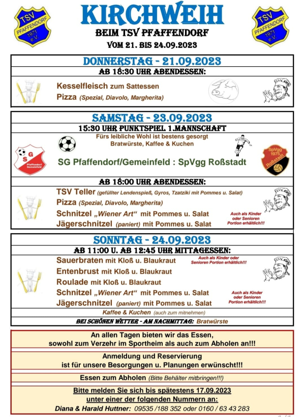 Der TSV Pfaffendorf lädt euch recht herzlich zur Kirchweih vom 21. bis 24.09.2023 ein.