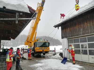 Einen ganzen Tag hat es gedauert das große Dach des Hofes von den Schneemassen zu befreien. Die Helfer, ob auf dem Dach oder am Boden zum Absichern und Koordinieren, hielten den kalten und regnerischen Bedingungen stand.